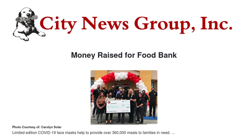 Feeding America Riverside | San Bernardino (FARSB), the regional food bank of the Inland Empire, received a substantial $45,000 donation from Envision Foods, LLC, a Jack In the Box Franchisee with over 50 locations, through a campaign to sell limited edition Jack in the Box face masks amid the COVID-19 coronavirus pandemic.