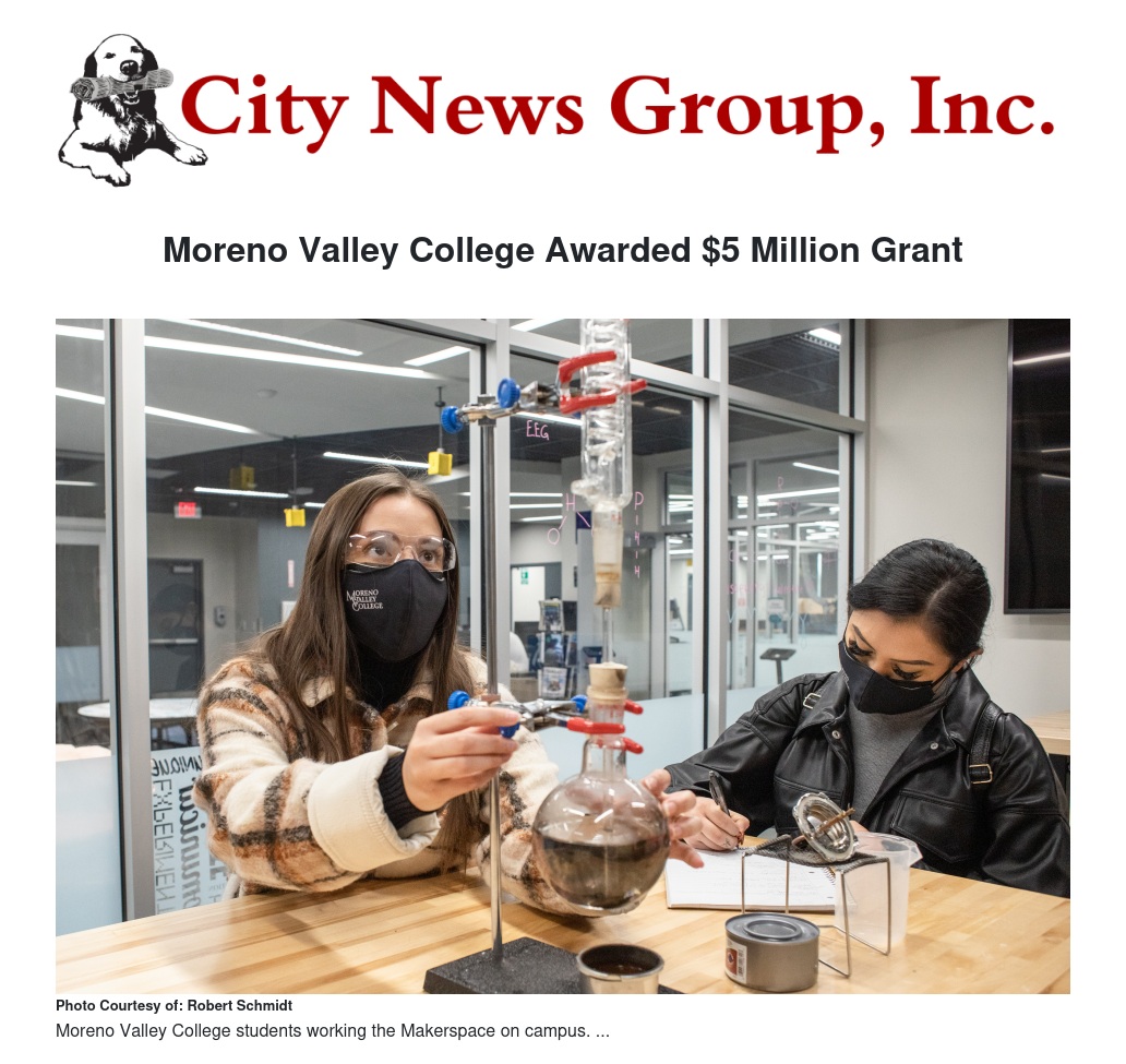 Moreno Valley College received a second Title III grant, the latest for $5 million. The College’s winning proposal, Experiential Learning: Closing the STEM Talent Gap, will address education delivery techniques with the goal of increasing transfer opportunities for Hispanic and low-income STEM students.