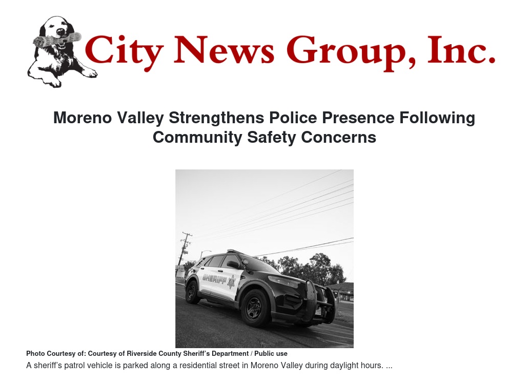 The Riverside County Sheriff's Department, which provides policing services for Moreno Valley, has expanded visible patrols and community engagement efforts in targeted areas.