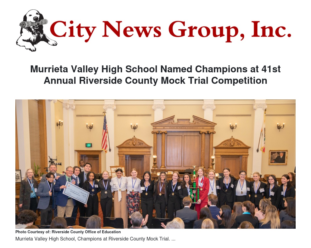 Murrieta Valley High School will now represent Riverside County at the California Mock Trial competition in Los Angeles, on March 17-19, 2023. The National Mock Trial Competition will be held on May 18-20, 2023, in Little Rock, Arkansas.