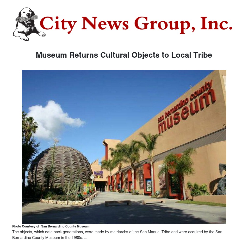 The San Bernardino County Museum announces the repatriation of culturally significant objects made by matriarchs of the San Manuel Band of Mission Indians. Coinciding with the annual National Native American Heritage Month, the approval for the transfer took place at the San Bernardino County Board of Supervisors’ Nov. 17 meeting.