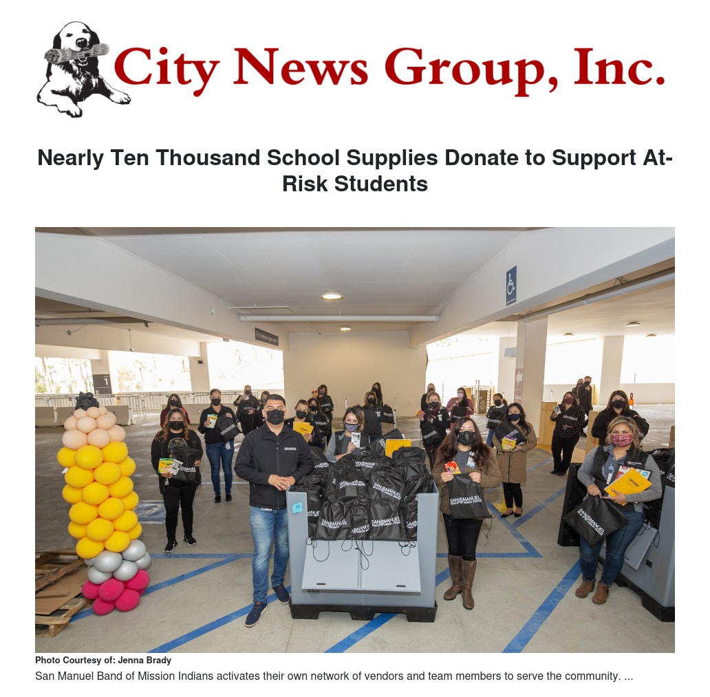 The San Manuel Band of Mission Indians donated 9,700 school supplies to the San Bernardino Unified School District (SBCUSD) Community Day School for the Access to Learning for All Students program (A.T.L.A.S).
