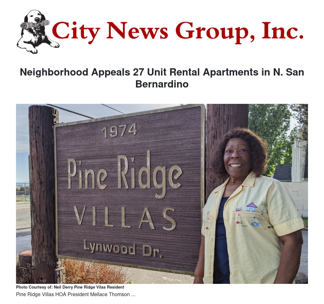 The Pine Ridge Villas Homeowners Association officially filed an appeal of the Planning Commission’s narrow, 4-3 vote to approve a high-density rental apartment project on Sterling Avenue and Lynwood Drive in North San Bernardino.
