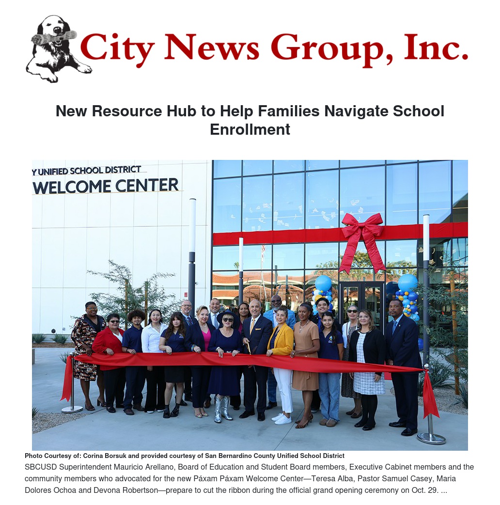 The San Bernardino City Unified School District (SBCUSD) celebrated the official grand opening of the Páxam Páxam Welcome Center on October 29, a new resource hub designed to help families navigate school enrollment and connect with support services that encourage student success. The center is located next to the District’s Board of Education building and is part of the District’s ongoing commitment to remove barriers and create welcoming spaces for all families.