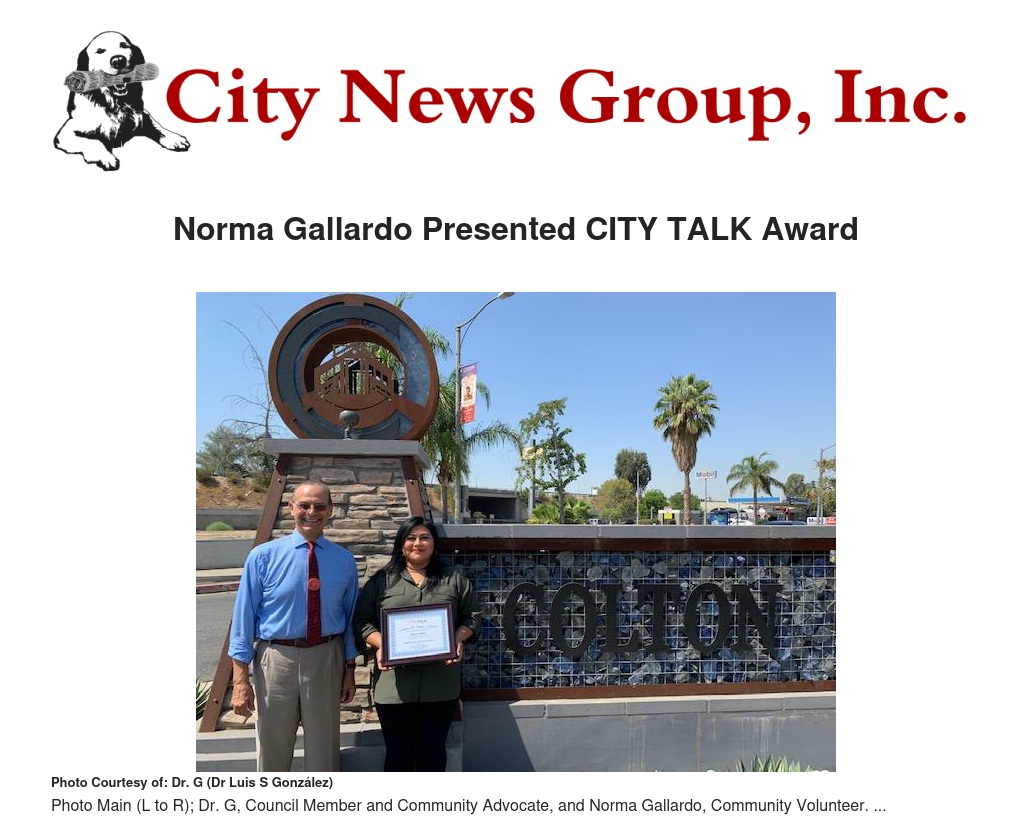 On Friday, August 19, Council Member Dr. G (Dr. Luis S González) presented the CITY TALK “Community Impact Award” to community volunteer, Norma Gallardo a long-time resident of Colton, and well-known community volunteer.