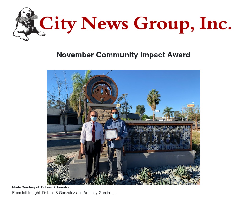 At a downtown gathering last Friday, Council Member Dr. G (Dr. Luis S Gonzalez) presented the November CITY TALK “Community Impact Award” to Anthony Garcia, long-time resident of Colton, and Founder of the non-profit organization Mobile Hand-up Solutions. Mr. Anthony is well-known throughout Colton, San Bernardino and Riverside as a community outreach volunteer who has devoted his time, effort, and resources to serve the needs of those residents who have experienced financial, physical, and social hardship.