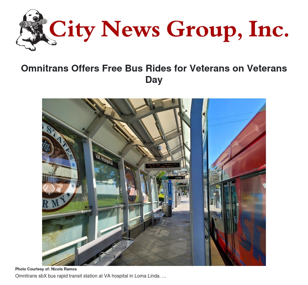 To thank and honor the men and women who have served in our nation’s armed forces, Omnitrans again is offering free bus rides to US military veterans all day on Veterans Day, Thursday, November 11.