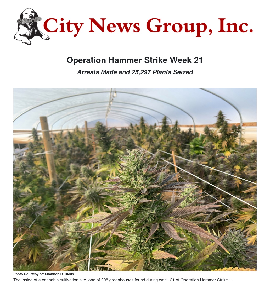 Between January 17, 2022, and January 23, 2022, investigators from the San Bernardino County Sheriff's Department - Marijuana Enforcement Team (MET), along with San Bernardino Sheriff's deputies from several different patrol stations, served 20 search warrants at various locations in Wonder Valley, Twentynine Palms, Hinkley, El Mirage, Pioneertown, Highland, Oro Grande, and Helendale. MET personnel had received numerous complaints about large outdoor and indoor marijuana cultivations in these areas. Over this past week, the San Bernardino County Sheriff's personnel located and arrested 25 suspects. Investigators seized 25,297 marijuana plants, 2,556 pounds of processed marijuana, 18 guns, 915 grams of concentrated marijuana, and over $12,000 in cash. Investigators eradicated a total of 208 greenhouses found at these locations, as well as a THC extraction lab. Investigators mitigated one electrical bypass and shut down one storefront dispensary.