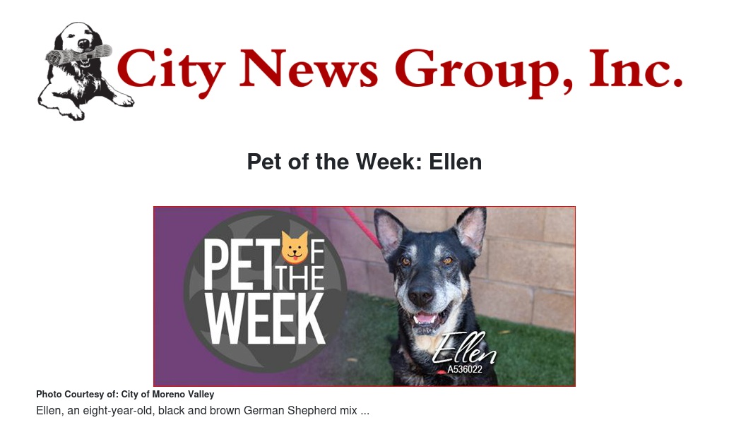 If you would like to make Ellen or any pet from the Moreno Valley Animal Shelter part of your family, please contact the Moreno Valley Animal Shelter at 951.413.3790 or visit www.moval.org/pets