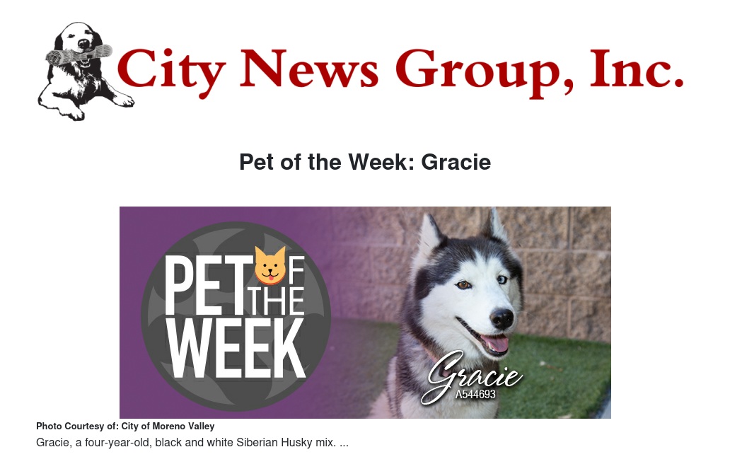 If you would like to make Gracie, or any pet from the Moreno Valley Animal Shelter, part of your family, please call 951.413.3790 or visit moval.org/pets.