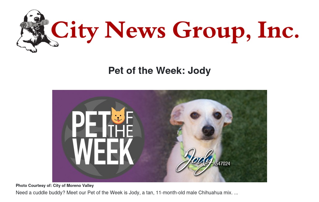 If you would like to make Jody or any pet from the Moreno Valley Animal Shelter part of your family, please call 951.413.3790 or visit moval.org/pets.
