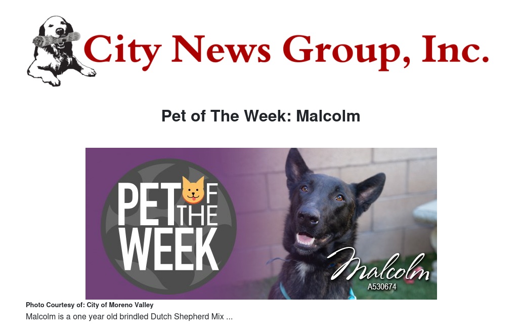 If you would like to make Malcolm or any pet from the Moreno Valley Animal Shelter part of your family, please contact the Moreno Valley Animal Shelter at 951.413.3790 or visit www.moval.org/pets. |