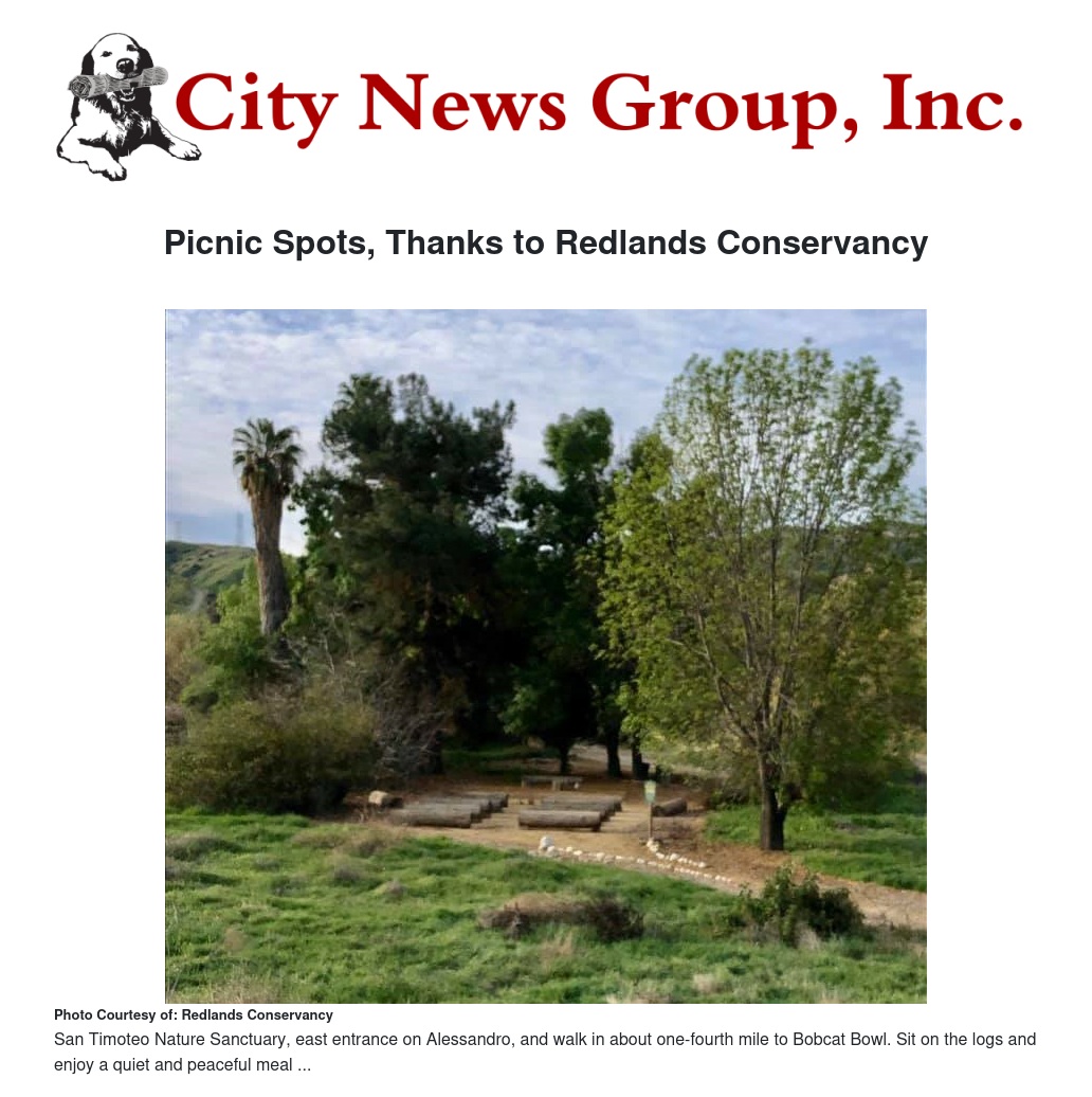 Are you craving an autumn outing with family and friends, perhaps a hike or a picnic? Redlands Conservancy has a few suggestions. At the Herngt 'Aki' Preserve at Oakmont Park (South Lane and Sutherland), you will find a few picnic tables ready for you. You can bring your picnic to San Timoteo Nature Sanctuary, east entrance on Alessandro, and walk in about one-fourth mile to Bobcat Bowl. Sit on the logs and enjoy a quiet and peaceful meal, except for the occasional train passing by. Or go to the west entrance and find your way to the picnic table on the north side of Beverley's Pond. Go to historic Asistencia, 26930 Barton Road on Sunday afternoons, and enjoy your picnic there in the courtyard. A final possibility: Gateway Ranch, 31313 Live Oak Canyon Road. Find a few spots: The Watering Hole, up the hill from the parking area and behind the house; Memorial Plaza, halfway up the hill, toward the road - there's a beautiful table there: take off the tarp when you want to eat, then replace the tarp when you leave. But, please don't carve anything into the table! Or, you can just walk through the Gateway Garden and sit in one of the Adirondack-style chairs to enjoy your picnic. As always, enjoy, and leave no trace.