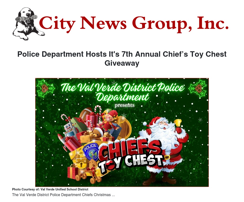 The Val Verde District Police Department is thrilled to announce the 7th Annual Chief’s Toy Chest toy giveaway!