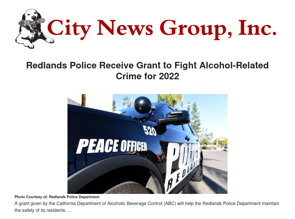 Redlands Police Receive Grant to Fight Alcohol-Related Crime for 2022 by Carl Baker - City News Group, Inc.