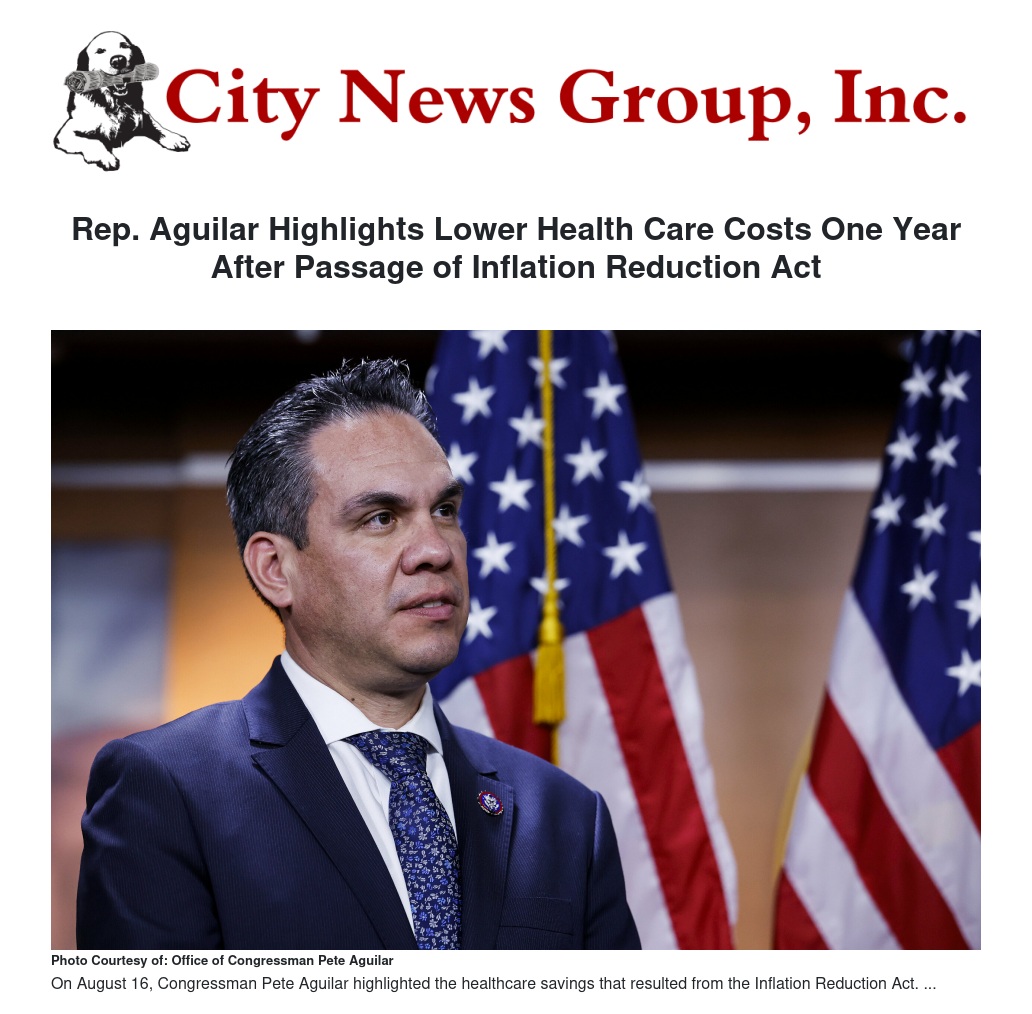 Rep. Aguilar Highlights Lower Health Care Costs One Year After Passage of Inflation Reduction Act by Office of Congressman Pete Aguilar - City News Group, Inc.