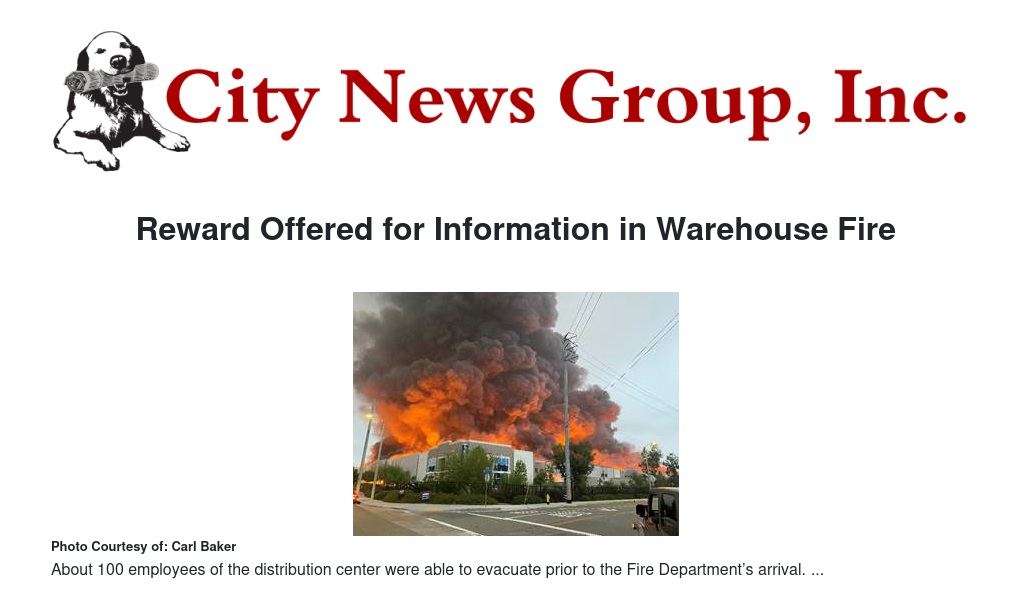 A reward has been offered for information leading to the arrest and conviction of the suspect or suspects responsible for a massive warehouse fire that caused millions of dollars in damage last June.