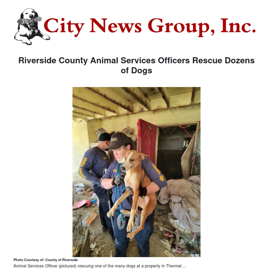 Riverside County Animal Services officers rescued dozens of dogs today from a property in Thermal where temperatures climbed to triple-digit figures.