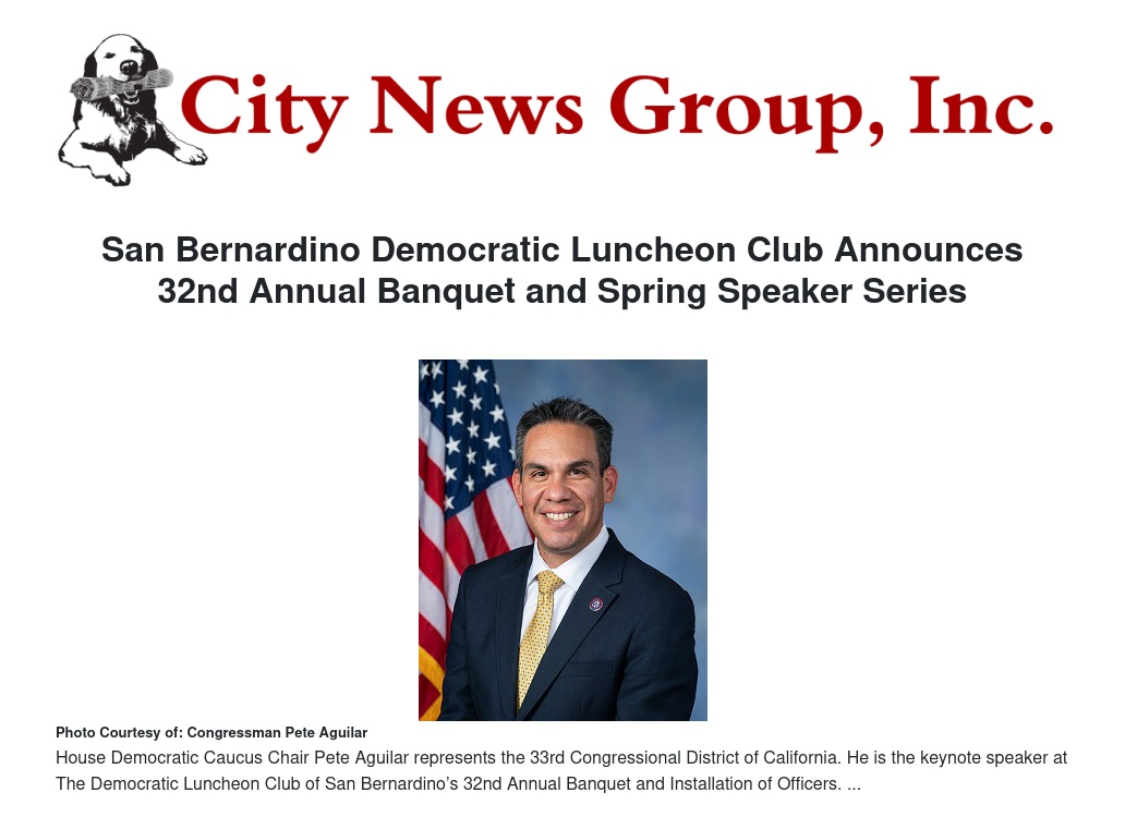 San Bernardino Democratic Luncheon Club Announces 32nd Annual Banquet and Spring Speaker Series by Carl M. Dameron - City News Group, Inc.