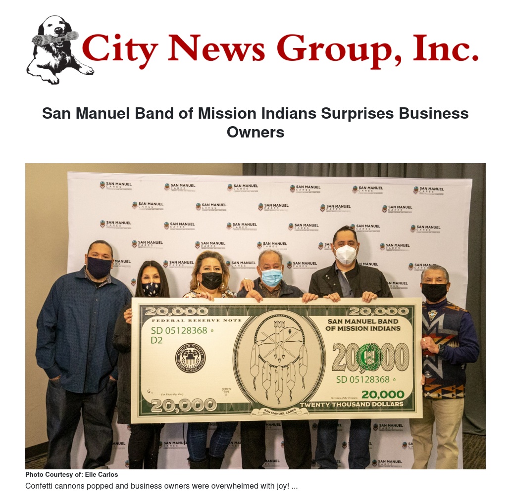 The San Manuel Band of Mission Indians surprised 50 small businesses with $20,000 each in a virtual live stream event. In collaboration with the Inland Empire Economic Partnership (IEEP) the