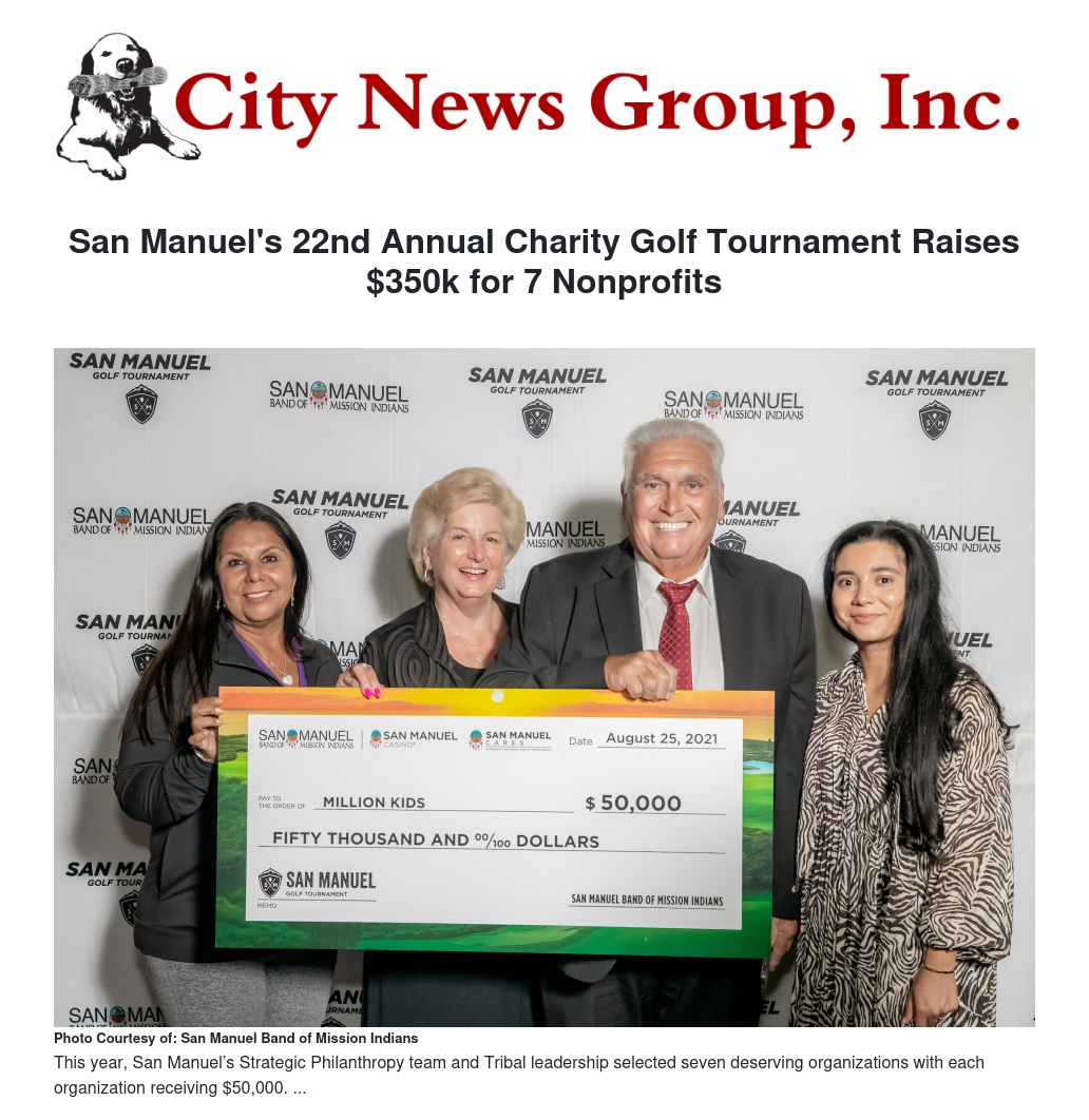 This year, San Manuel’s Strategic Philanthropy team and Tribal leadership selected seven deserving organizations with each organization receiving $50,000. The nonprofits selected represent education, healthcare, economic and community development and the preservation of cultural traditions in Indian country. The 2021 golf tournament charity recipients included Million Kids; Hopi Education Endowment Fund; Cruz Chacon Foundation; Mountain Meals on Wheels; Foothill Family Shelter; BLU Educational Foundation, and the Notah Begay III (NB3) Foundation.