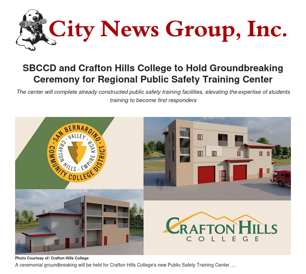 The San Bernardino Community College District (SBCCD) and Crafton Hills College (CHC) invite the public to a groundbreaking event, kicking off the Measure CC projects at the Yucaipa-based college. The groundbreaking event for the new Public Safety Training Center begins at 1:00 p.m. on Friday, January 20, at Crafton Hills College at 11711 Sand Canyon Rd., Yucaipa, Calif., 92399.