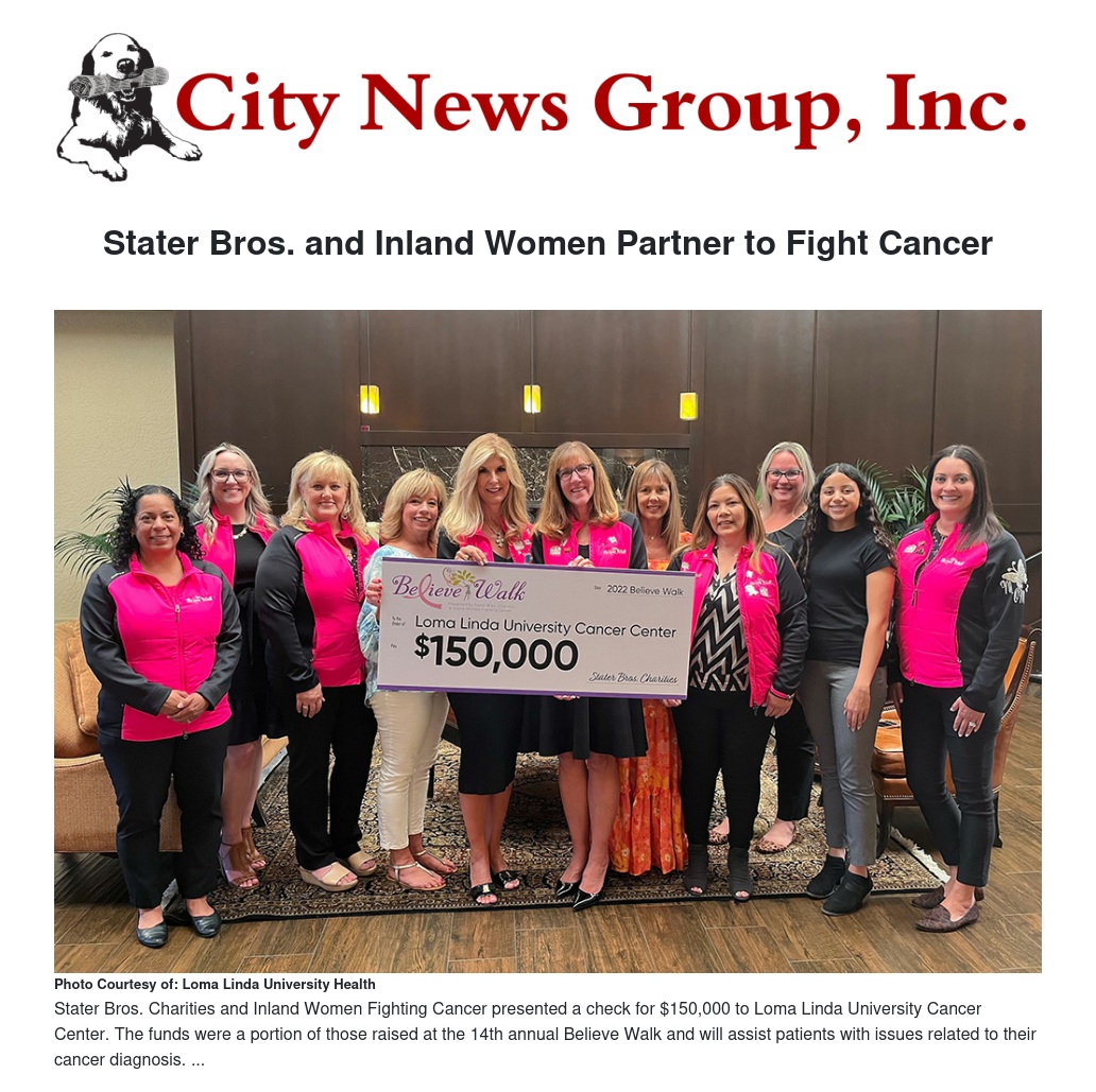 Stater Bros. Charities and Inland Women Fighting Cancer presented a check for $150,000 to Loma Linda University Cancer Center on Tuesday, August 16. The funds were a portion of those raised at the 14th annual Believe Walk held in October 2021 and will assist patients at LLU Cancer Center with issues related to their cancer diagnosis.