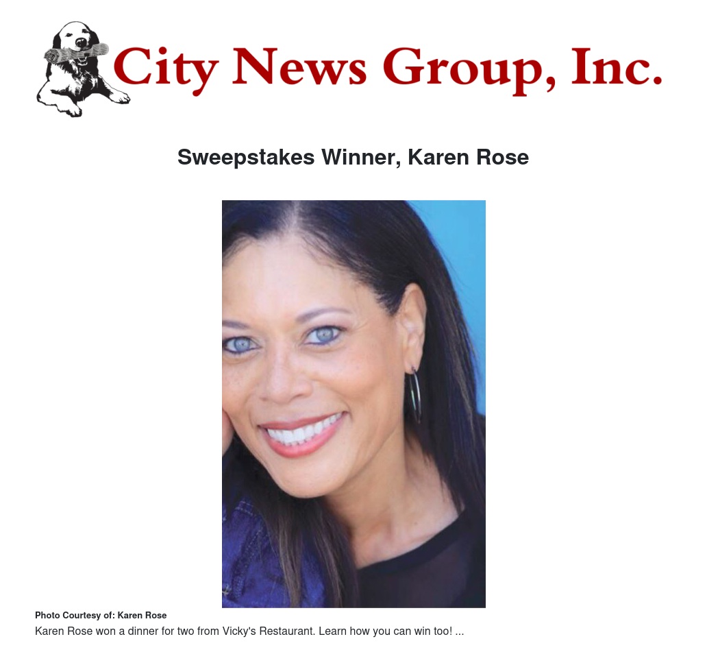 Karen Rose is this week’s winner of the City News Group, Inc. $1,000 sweepstakes opportunity drawing! As this week’s winner of the weekly prize giveaway, Rose has won a dinner for two from Vicky’s Restaurant.