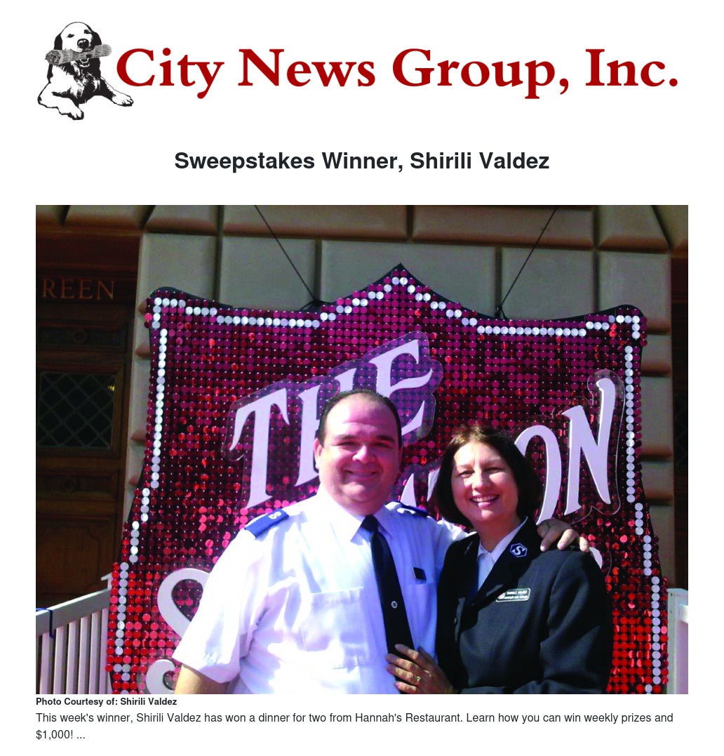 As this week’s winner, Valdez and everyone who enters into the City News Group Sweepstakes, has the chance to win $1,000 on December 3rd!