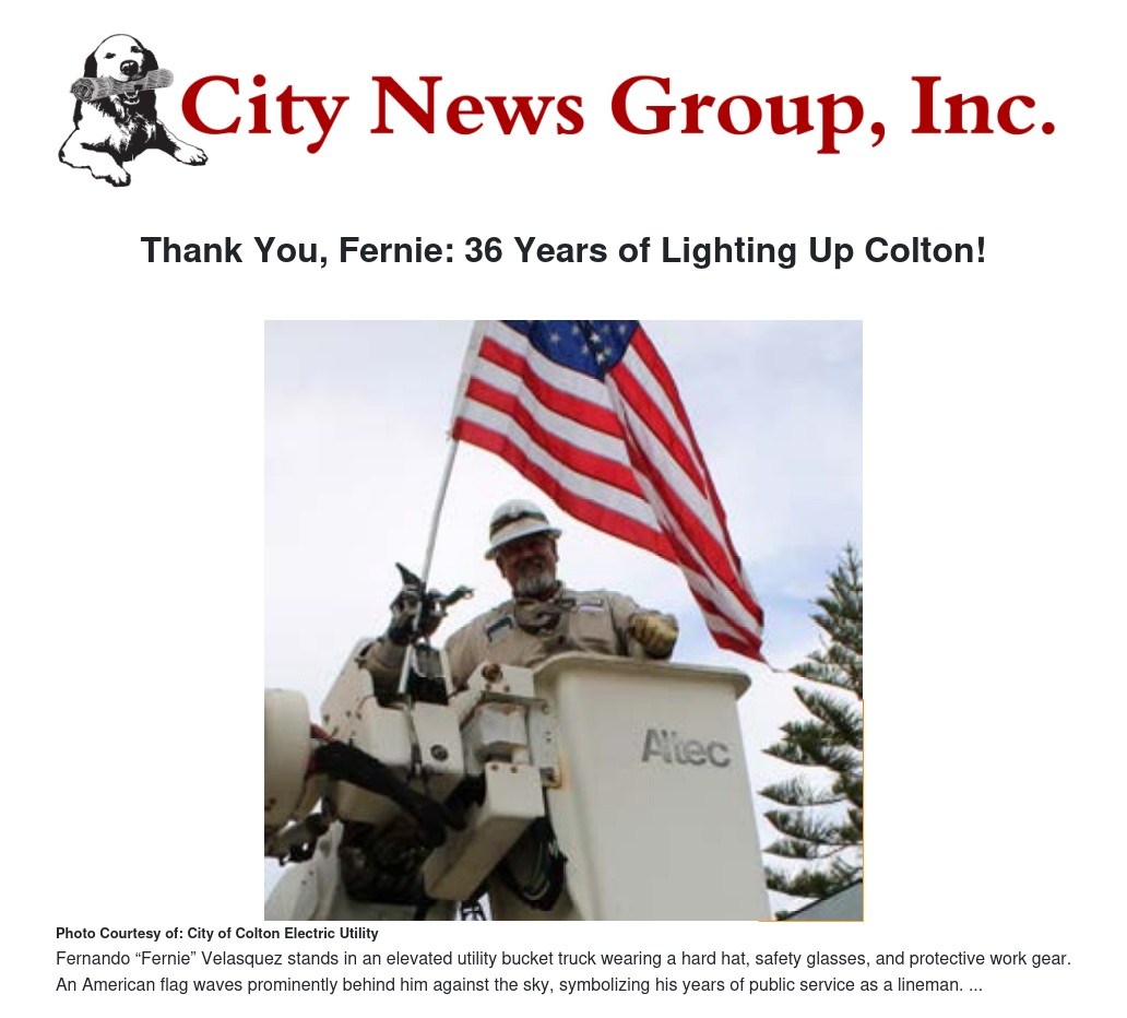 “Fernando represents the best of what public service is all about,” said Charles Berry, Colton Electric Director. “His professionalism, teamwork, and dedication to the people of Colton have set an example for everyone who’s had the privilege to work alongside him.”