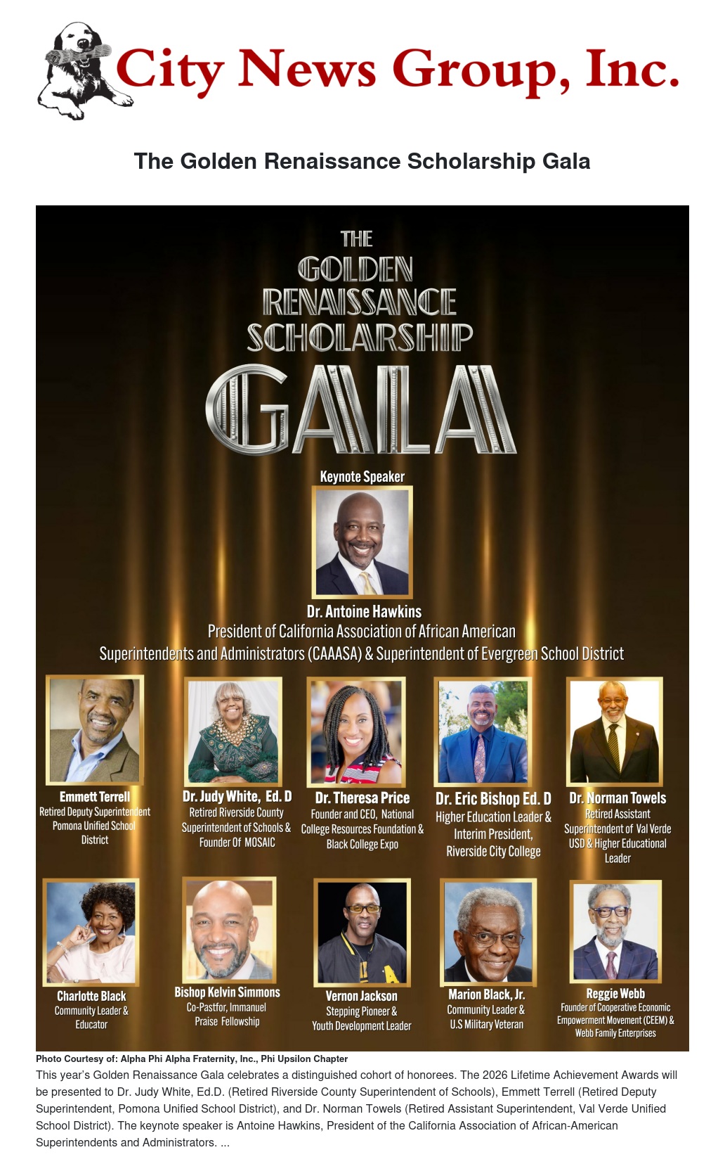 Alpha Phi Alpha Fraternity, Inc., Phi Upsilon Chapter’s inaugural Golden Renaissance Scholarship Gala recognizes Black leaders whose contributions have shaped education, public service, and community empowerment in the Inland Empire. The Gala is Sunday, May 17, 2026, at 6:00 PM, in the Grand Parisian Ballroom at the Mission Inn Hotel & Spa in Riverside, California.