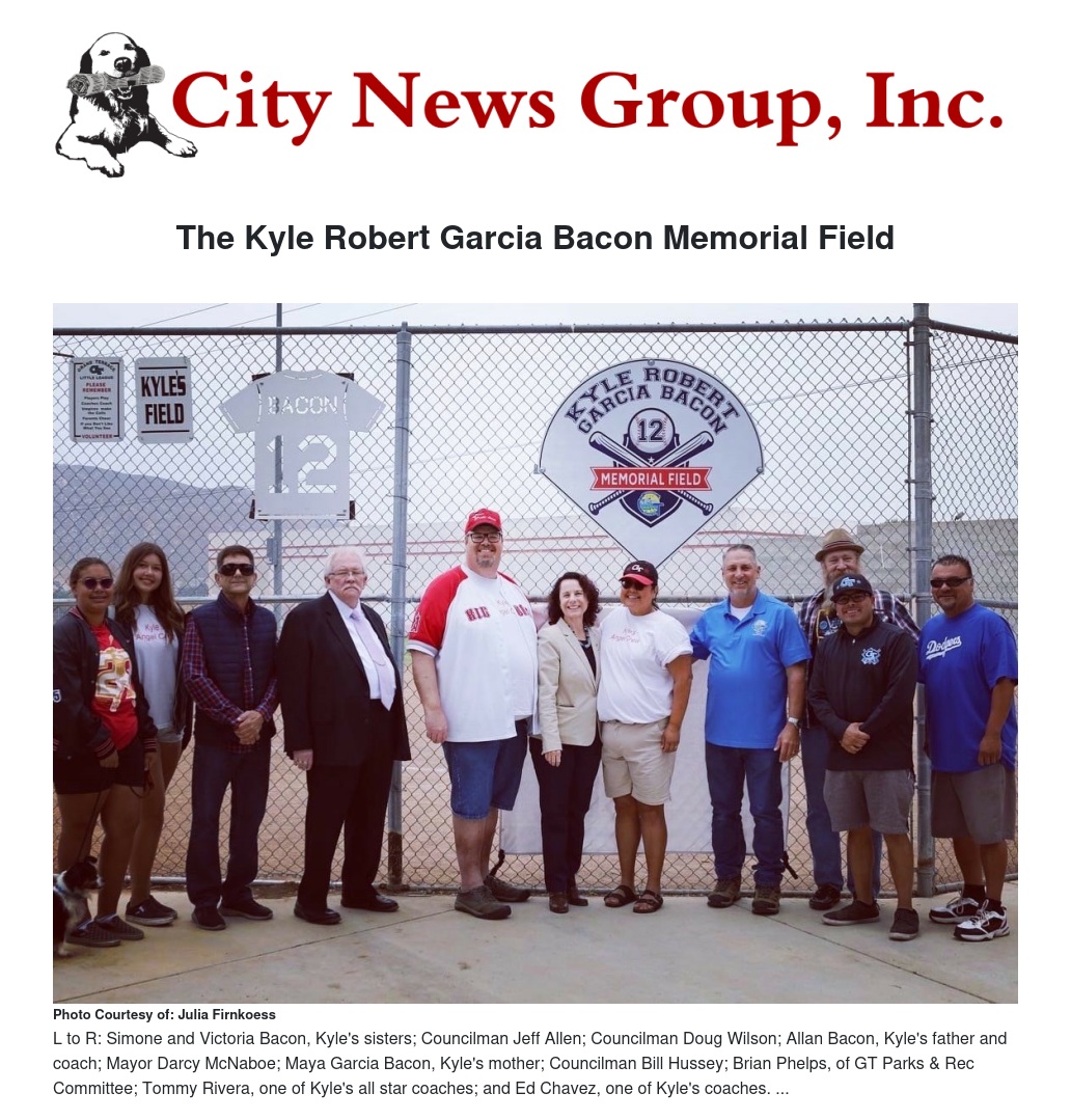 Someone on the GT Little League at the time named the t-ball field after Kyle. What an amazing and loving thing to do. On April 2nd, 2022, the City of Grand Terrace, City Council, and Mayor Darcy McNaboe presented an official naming of the field as the Kyle Robert Garcia Bacon Memorial Field. In attendance were the Bacon family, several of Kyle’s coaches including Tommy Rivera, Bill Hussey, and Ed, and Kyle’s 6th grade Terrace View teacher Mr. Fletcher.