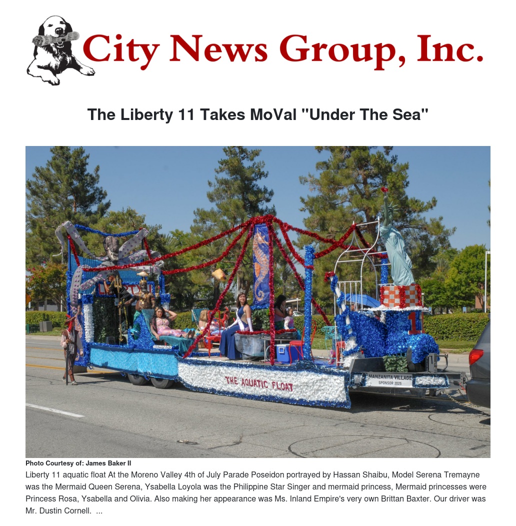 The Liberty 11 Aquatic Float immersed the City of Moreno Valley in an enchanting "Under the Sea" spectacle during the 2025 annual 4th of July Parade. Crafted and designed by James C. Baker, Park Commissioner for Moreno Valley, the float garnered the prestigious Outstanding Craftsmanship Award in the Sweepstakes category.