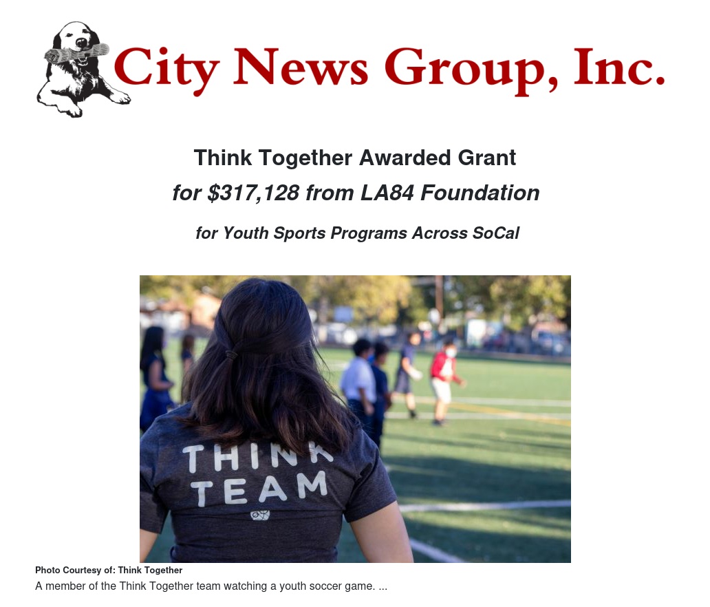 Think Together, California’s leading nonprofit provider of afterschool, expanded learning and school improvement programs, today announced the award of a $317,128 grant from the LA84 Foundation, a nationally recognized leader of youth sports programs focused on positive youth development. This grant will allow more students from under-resourced communities to participate in free team sports opportunities.