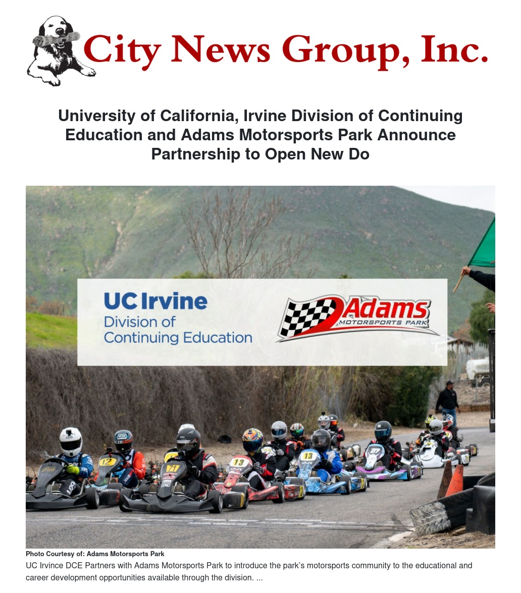Adams Motorsports Park and the University of California, Irvine Division of Continuing Education (UC Irvine DCE) have launched a new marketing partnership to introduce the park’s motorsports community to the educational and career development opportunities available through the division.