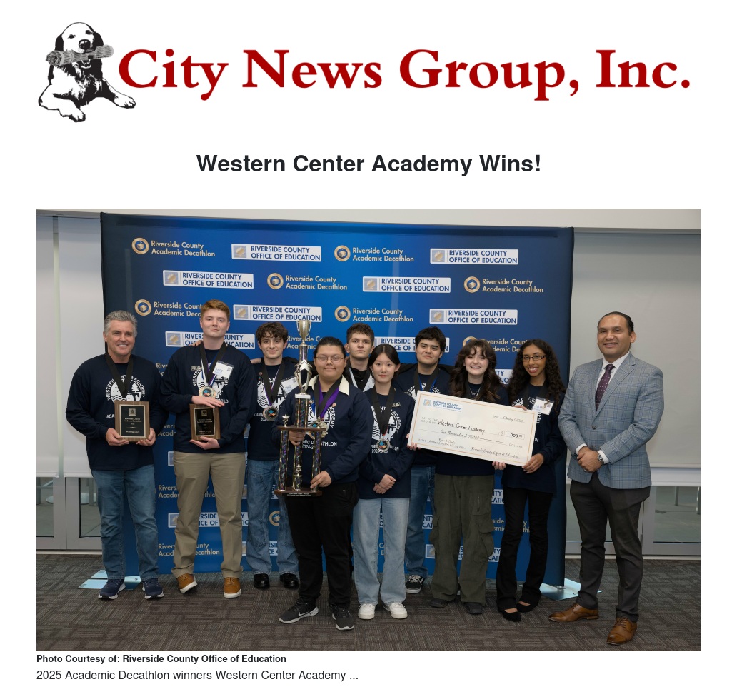 “All of the students who participated in this year’s Riverside County Academic Decathlon epitomize the excellence of their respective schools while serving as outstanding examples of teamwork, collaboration, and academic focus,” said Riverside County Superintendent of Schools, Dr. Edwin Gomez. “Congratulations to Western Center Academy as they prepare to compete at the California Academic Decathlon next month and proudly represent Riverside County.”